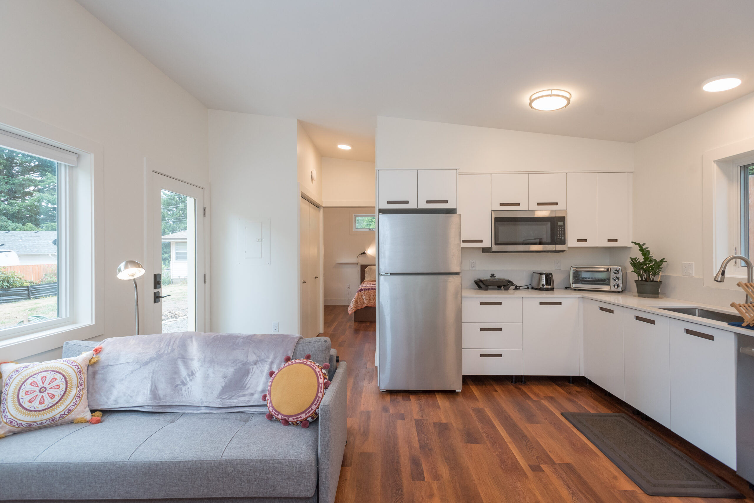 In Milwaukie, OR and the Portland metro area, it is only possible to have one Accessory Dwelling Unit (ADU). Since our Guest Suites are not ADUs, you can add a Guest Suite even if you have an ADU! You can even add multiple Guest Suites to your property, creating a little community of buildings. That is exactly what we did with our 1-Bedroom Guest Suite.